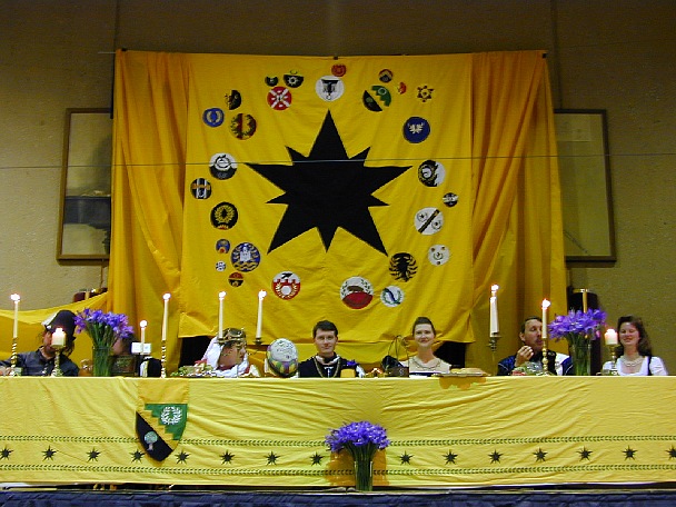 tqc0201-60.jpg 3.0Ktqc0201-61.jpg 3.5K On the left, Their Majesties draw closer to Their populace to deliver heartfelt words of thanks. On the right, the high table was wonderfully adorned. The decorations were not bad either.